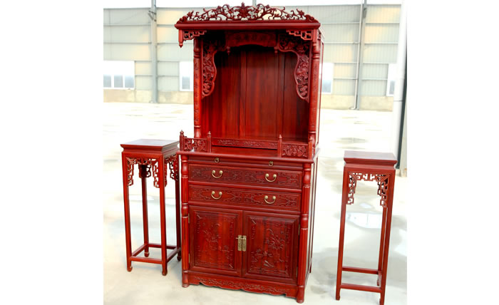 江蘇中尊木業(yè)有限公司臥室系列產(chǎn)品:佛光普照大佛龕,臥房四件套富貴大床、富貴大床床邊柜、四門(mén)衣柜等。